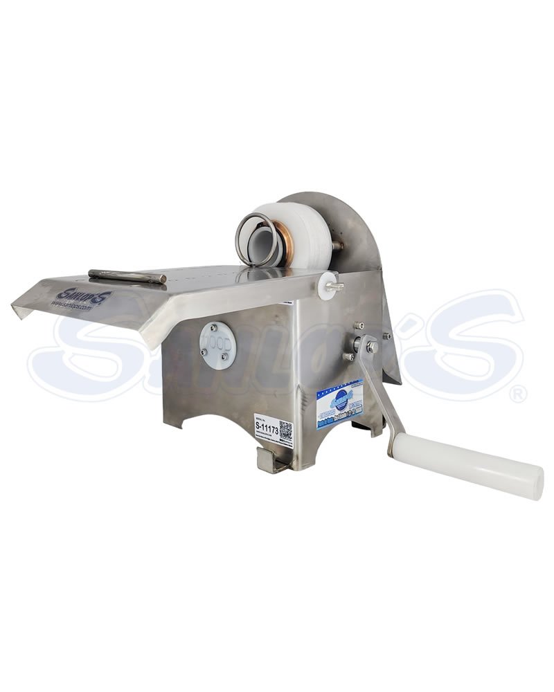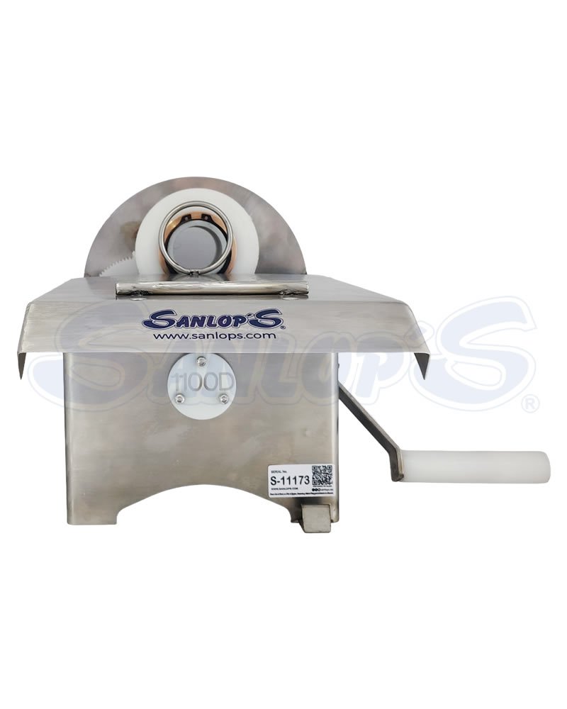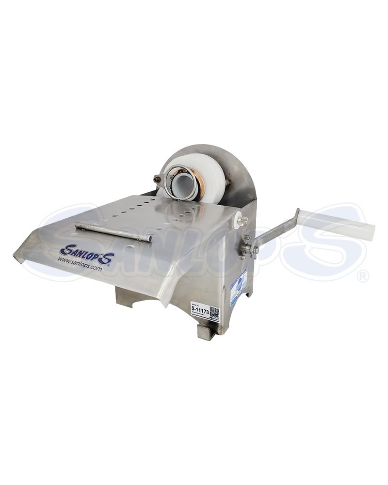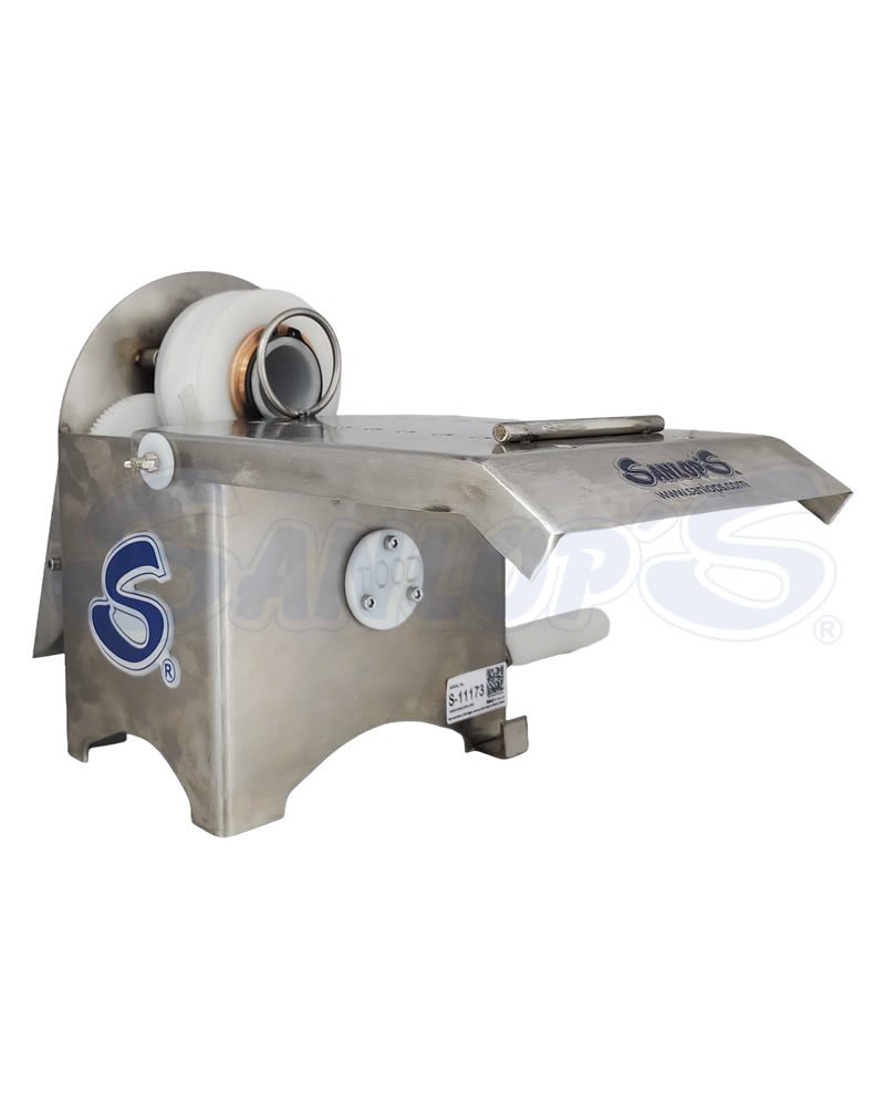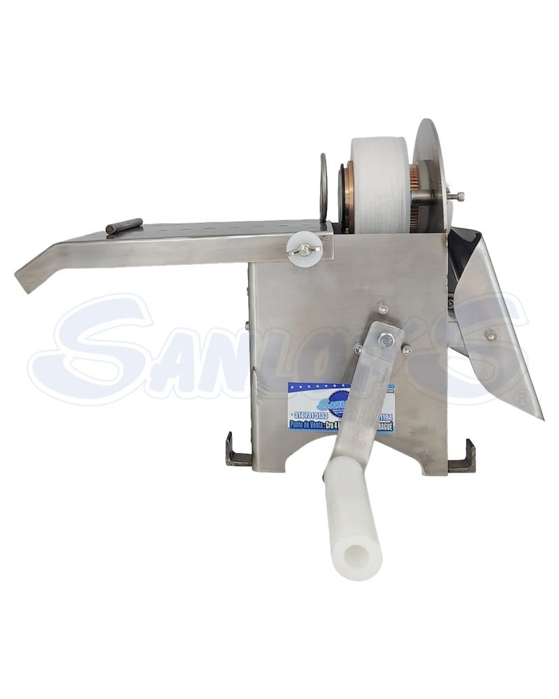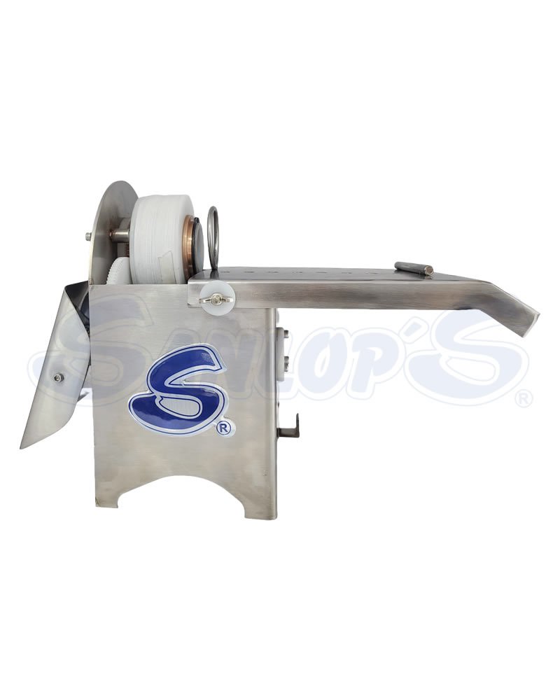 Amarradora manual continúa (sin corte de hilo) fabricada en acero inoxidable 304 grado alimenticio, cuenta con piñoneria en nylon y bronce, lo que la hace resistente y duradera, ideal para el proceso productivo de cualquier embutido (chorizo, longaniza, morcillas, butifarras, etc.) recibe producto con un diámetro máximo de 4 cm y cuenta con una bandeja que permite medir la longitud del producto desde 2 cm hasta 20 cm. Producción nominal hasta 70 chorizos por minuto.