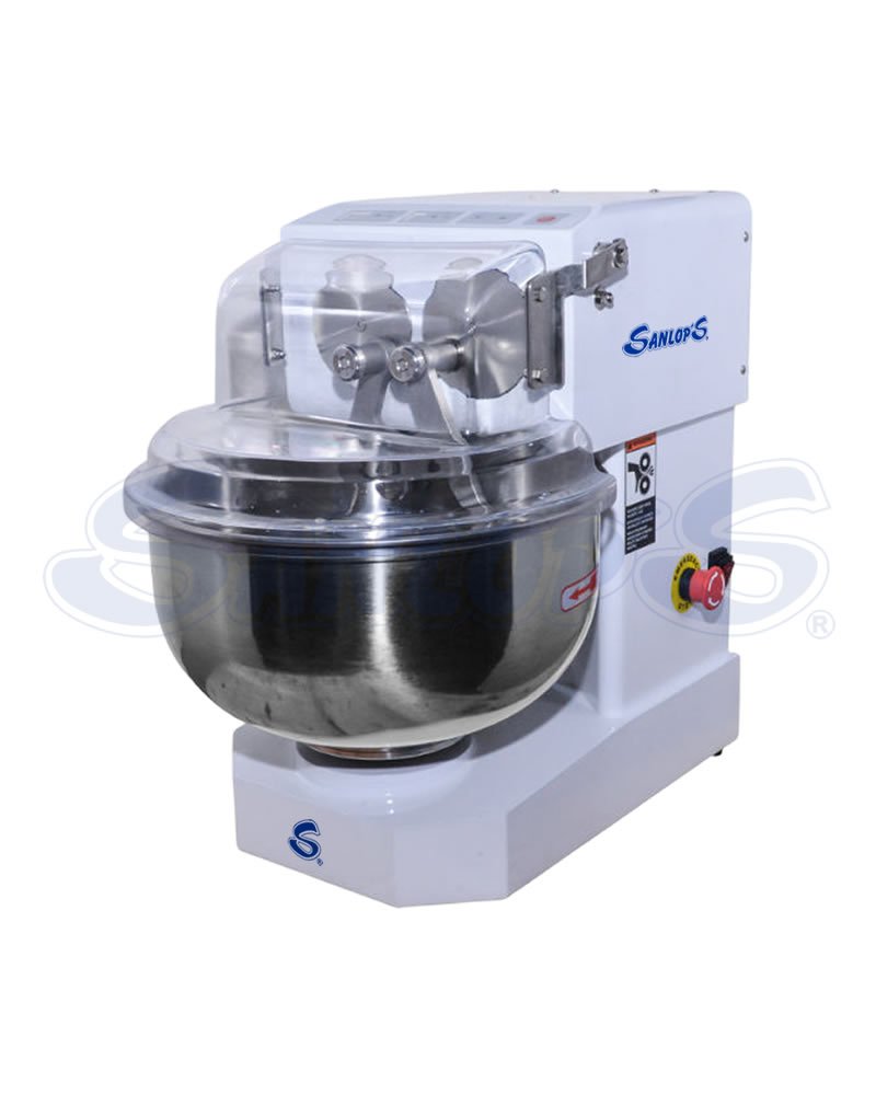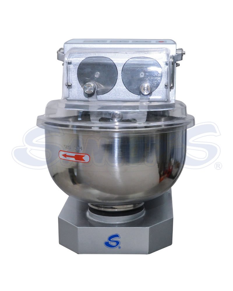 Amasadora de brazos marca JAVAR, modelo de mesa. Capacidad 11 kg de masa (7 kg o 1/2 @ de harina con hidratación mínima del 60%), olla de 30 lt, estructura fabricada en acero acabado con pintura electrostática. Olla y brazos de acero inoxidable fácilmente extraíbles para la limpieza y el retiro de la masa. Control digital con 5 velocidades (entre 35 y 65 RPM) y temporizador. Incluye botón de paro de emergencia y protector de seguridad con sensor de apertura. Transmisión por correas y variador electrónico de velocidad. Potencia eléctrica 1,5 kW (2 HP), un motor. Tensión 110 Volt, 60 Hz, 1 fase. Origen: China