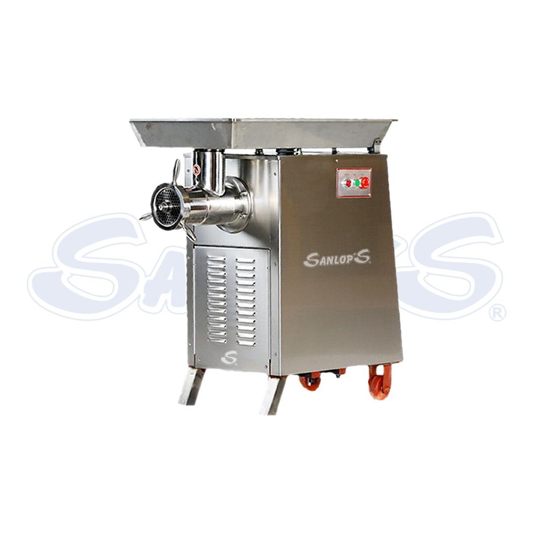 Equipo de trabajo industrial para moler carne, verduras, maíz y otros granos, esta fabricado en acero inoxidable 304 grado alimenticio, cuenta con un motor de 5Hp de potencia a 220 voltios, rendimiento nominal de 400kg/h con pausas sistemáticas para evitar sobrecalentamiento, encendido con botón de seguridad para hacer fácil el trabajo del operario. Equipo de fácil uso y limpieza ya que la bandeja, cabezote y sinfín son removibles sin herramientas.